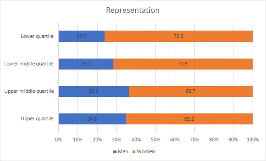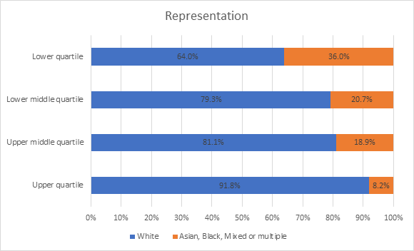 The pay gap reports also include information about the representation of colleagues of different backgrounds and genders at different levels of the charity. This is because the level of representation in higher paid roles is a key driver of pay gaps. It also helps us to track our progress towards becoming a charity that fully represents the diversity of the communities we serve.